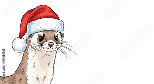 © Nii_Anna, Fototapeta premium Weasel wearing a Santa hat with a festive expression on white background