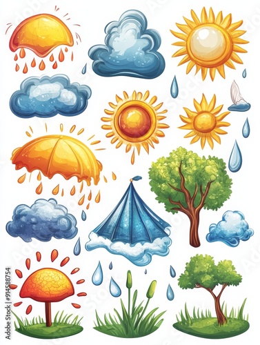 Fototapeta premium Weather Icons Collection: Sun, Rain, Clouds & Trees