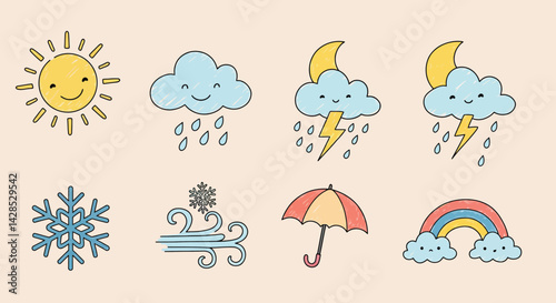 Naklejka premium Weather icons set including sun, cloud, rain, lightning, snowflake, wind, umbrella, and rainbow vector illustration
