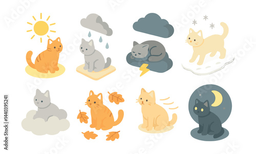 Fototapeta premium Weather-themed cat icons set – sun, rain, storm, snow, clouds, moon, leaves,...