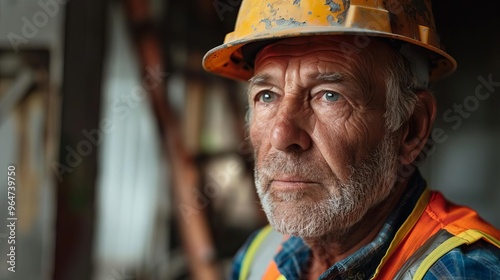 Fototapeta premium weathered american construction worker portrait experienced builder in hard hat and safety vest authentic charm