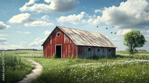 © Bos Amico, Obraz premium Weathered Barn in a Scenic Countryside Landscape with Lush Greenery and Fluffy Clouds
