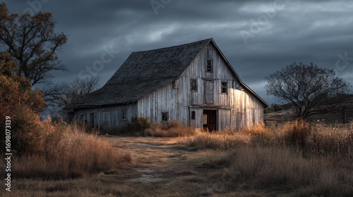 © Nadiatul, Obraz premium Weathered Barn Under Dramatic Sky Evokes Rural America Tranquility
