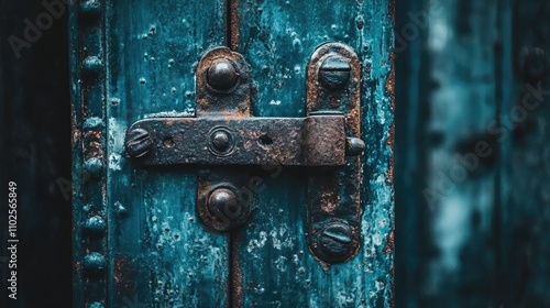 © Matcha_09, Fototapeta premium Weathered Blue Door with Vintage Rusted Lock and Latch Detail