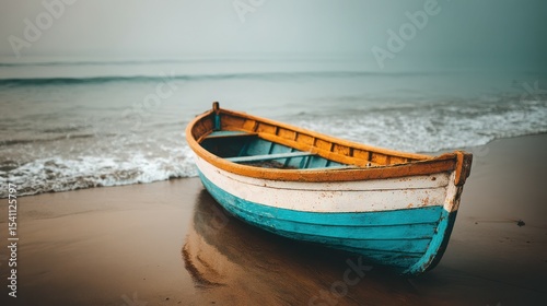 © Sansern, Naklejka premium Weathered Blue Fishing Boat on Sandy Shoreline