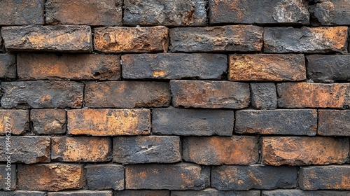 © Arieswanto, Obraz premium Weathered Brick Wall with Burnt and Orange Bricks