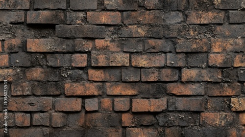 Obraz premium Weathered brick wall with dark char and scorch marks reflecting the aftermath...