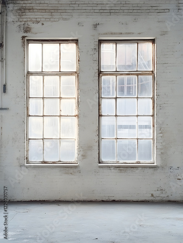 Fototapeta premium Weathered Brick Wall with Large Vintage Windows in Rustic Industrial Room :...