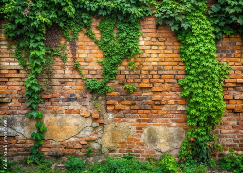 Fototapeta premium Weathered brick wall with overgrown vegetation and vines