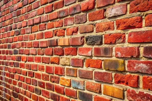 © Kingphet, Obraz premium Weathered brick wall with varied shades of red and rough texture at tilted angle