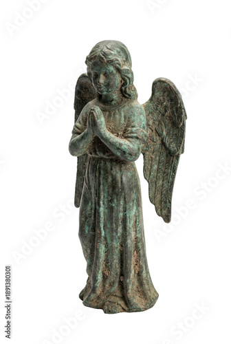 Obraz premium Weathered bronze praying angel statue isolated. Religious sculpture.