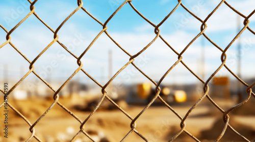 Fototapeta premium Weathered chain link fence surrounding construction zone, metal equipment blurred behind, protective barrier against potential intrusion