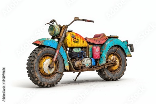Obraz premium Weathered Colorful Motorcycle on White Background