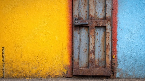 © Thanyaporn, Naklejka premium Weathered Door Against Brightly Colored Textured Wall Background