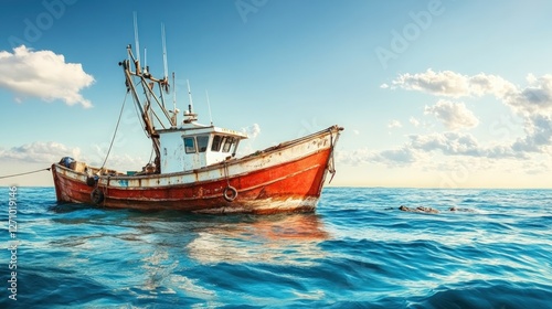 © Phanupong, Fototapeta premium Weathered Fishing Boat Bobbing Gently on Calm Blue Ocean Waves