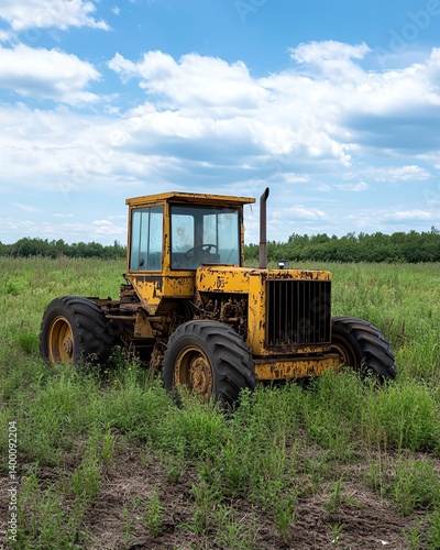 © jitthanant, Obraz premium Weathered grader parked in field with overgrown grass, abandoned machinery feel