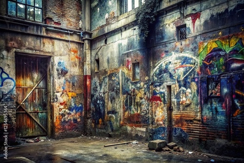 Fototapeta premium weathered graffiti-covered wall with layers of spray paint, tags, and urban decay