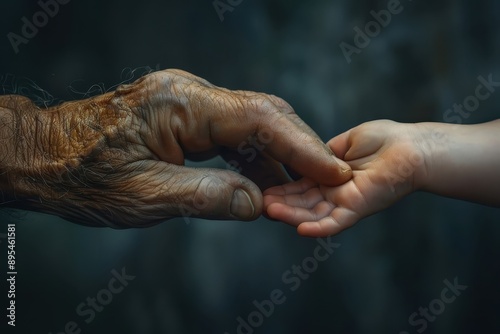 Fototapeta premium Weathered hand holding a newborn's tiny hand.