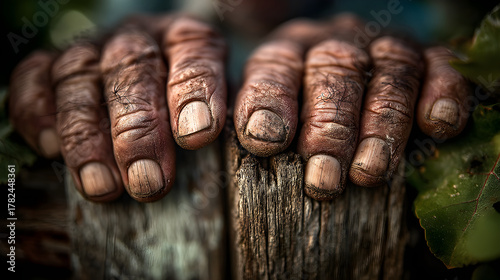 © Sanzharstock, Obraz premium Weathered hands grasping wooden post symbolizing hard work and enduring life