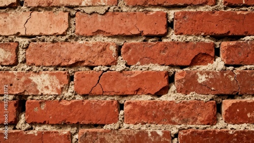 © ibhonk, Obraz premium Weathered, historic, red clay brick wall showing rough texture and chipped, cracked tan mortar in a tight pattern.