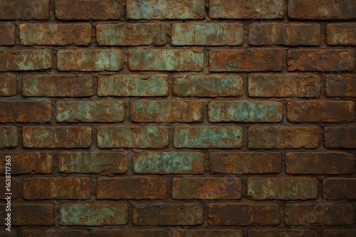 © Marica, Obraz premium Weathered industrial brick wall with copper patina accents creating authentic urban texture backdrop for architectural and design presentations