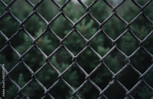 © Vadym, Fototapeta premium Weathered metal chain link fence shows diamond pattern with green foliage blurred in background. Grungy, industrial texture conveys restriction or security.