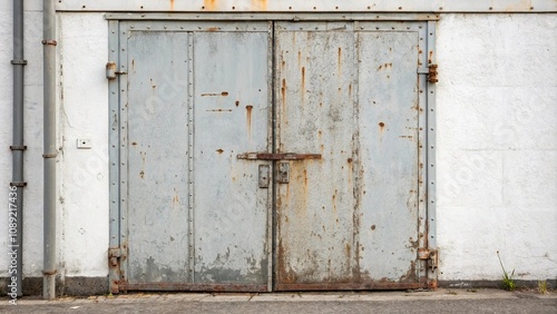 © Chanchai, Naklejka premium Weathered metal door with rusty hinges and scratches, cracked brick, scratched surface, crumbling mortar