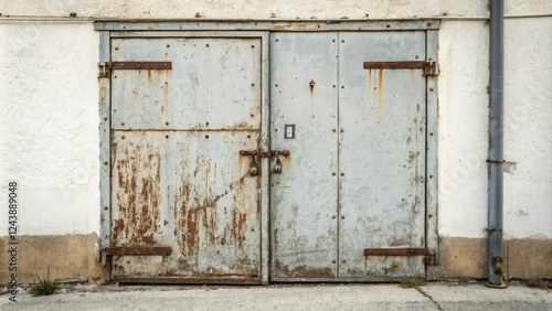© Chanchai, Naklejka premium Weathered metal door with rusty hinges and scratches, rusty hinges, faded paint, scratched surface, crumbling mortar