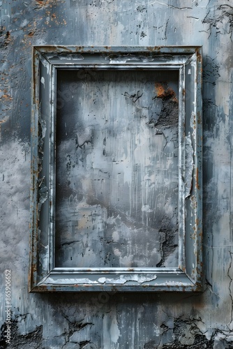 Naklejka premium Weathered Metal Frame Against Textured Concrete Wall - Gritty Industrial...