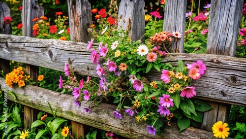 © Rafay, Fototapeta premium Weathered Old Fence with Flowers