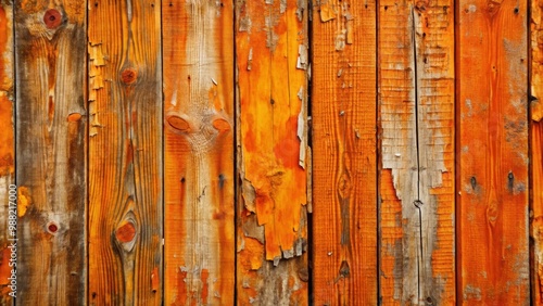 Fototapeta premium Weathered orange paint peeling on rough wood wall, orange, paint, peeling,...