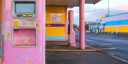 © Lila Patel, Fototapeta premium Weathered Pink Gas Pump Payment Terminal and Gas Station Facade