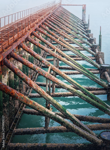 © psychoshadow, Fototapeta premium Weathered, rusty support structure of a pier or jetty extending into foggy turquoise water. The metal beams are heavily covered in rust, algae, and barnacles. The fog creates a moody background