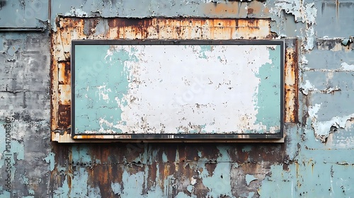 © abangaboy, Naklejka premium Weathered Signboard on a Rustic, Teal-Colored Wall