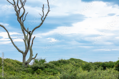 Obraz premium Weathered Southern Live Oak Tree in Green Bushes with Blue Sky