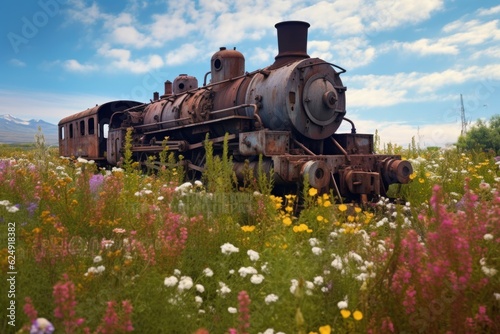 Fototapeta premium weathered steam engine in a sea of wildflowers, created with generative ai