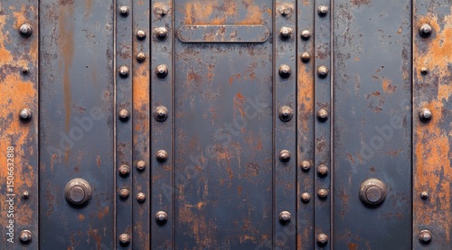 Fototapeta premium Weathered steel plate with rivets, showing rust and discoloration, exhibiting...