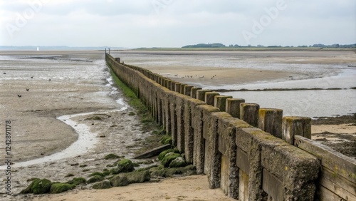 Fototapeta premium Weathered stone walls of a groyne stretch out into the mudflats at low tide, creating a unique habitat for wading birds and other wildlife, groynes, erosion patterns