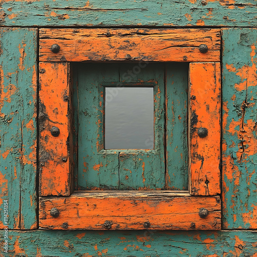 Naklejka premium Weathered teal and orange wood framed window.