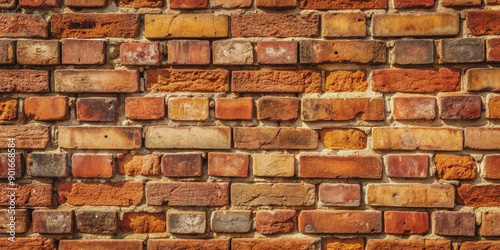 Naklejka premium Weathered terracotta brick wall with rusty reddish-brown hues, visible mortar...