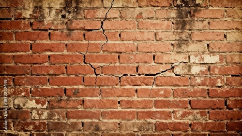 © ibhonk, Naklejka premium Weathered terracotta red brick wall displaying a prominent vertical structural crack, heavily stained with grunge and moisture decay.