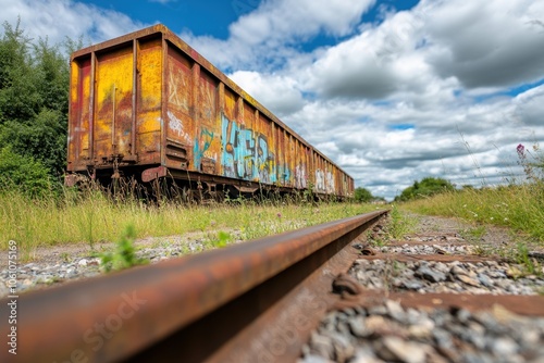 Obraz premium Weathered Train Car Sits Along Overgrown Tracks Under a Blue Sky With Fluffy...