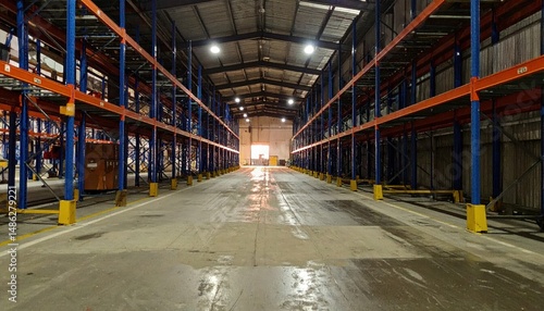 © Kitta Studio, Obraz premium Weathered Warehouse Interior with Shelving Units at Night Scene