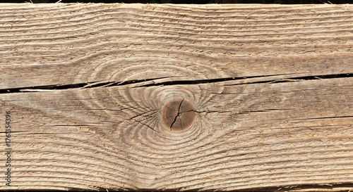 © Isak, Naklejka premium Weathered wood plank with prominent knot and cracks exhibits natural patterns