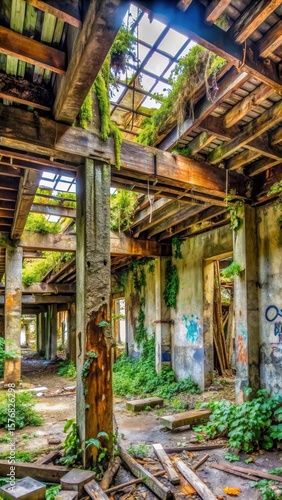 © Pitipat, Fototapeta premium Weathered wooden beams sprawl inside a crumbling building