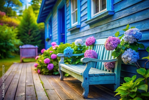 © Sirinporn, Fototapeta premium Weathered Wooden Bench on Blue Porch with Hydrangeas - Tilt-Shift Photography