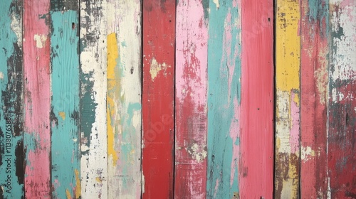Obraz premium Weathered wooden boards with vibrant paint remnants in various colors creating a rustic and artistic background texture for design projects.