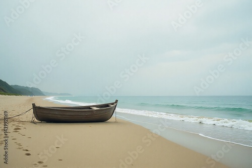 © Rijal, Naklejka premium Weathered wooden boat on sandy beach at dawn or dusk