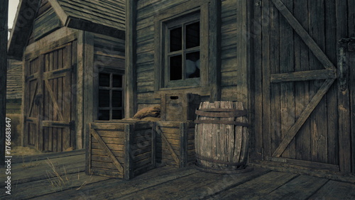 Obraz premium Weathered wooden crates and a barrel stand outside an old farmhouse. The rustic structure exudes charm as the evening light casts shadows across the weathered wood.