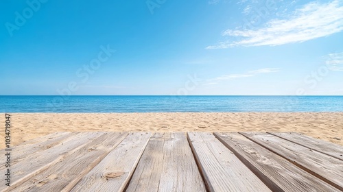 Fototapeta premium Weathered Wooden Dock on a Golden Sand Beach with Serene Ocean Horizon